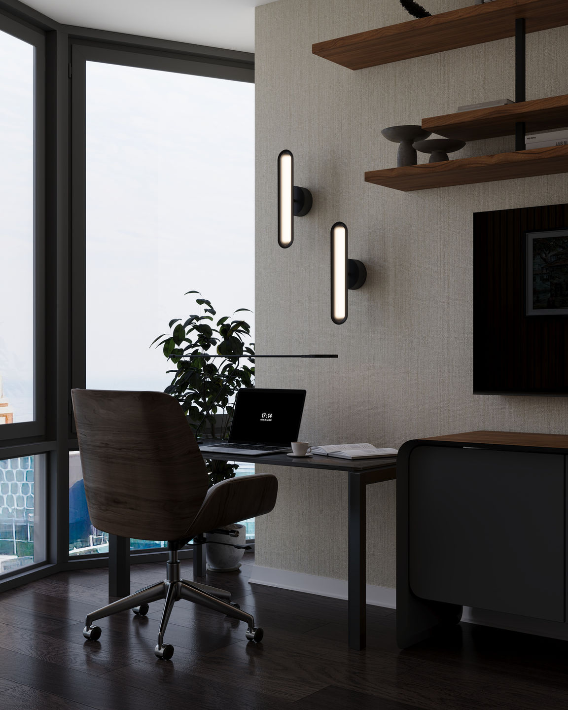This three-bedroom condo in Chicago’s Cirrus Tower underwent a comprehensive renovation to create a refined and contemporary living experience. The transformation covered the living room, bar and dining area, master bedroom, foyer, guest bedroom/her office, his office, and all three bathrooms. Warm wood finishes mirroring the kitchen millwork were carried throughout the home to complement the sleek grey furniture and matching window frames, creating a harmonious flow from room to room. Modern light fixtures add sculptural interest and a polished, streamlined touch to every space. The result is a cohesive, elevated interior that balances luxury with livability.